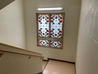 館内は優しい色合いでまとめられ、階段には可愛らしいステンドグラスが