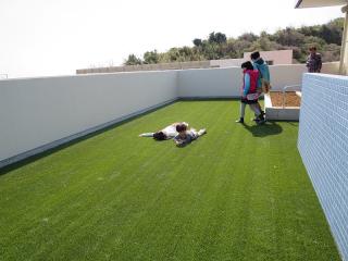 ベランダの芝生で寝そべったり、